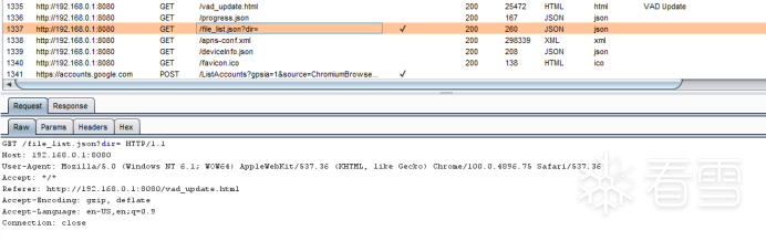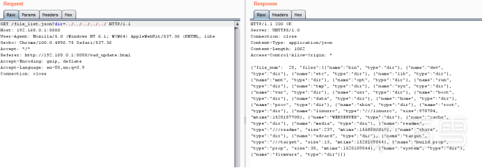 查看BurpSuite历史记录,发现http://192.168.0.1/file_list.json?dir=请求比较有意思,dir指定目录,返回包返回了json格式的目录信息。