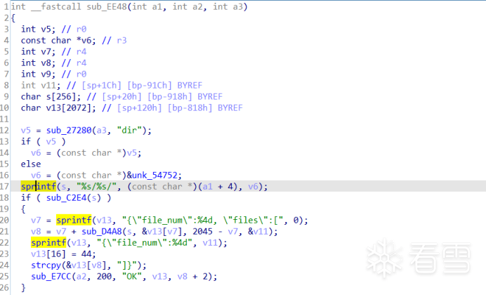 发现解析http://192.168.0.1/file_list.json?dir=请求时,sub_EE48函数会将dir参数的内容拼接到栈空间s中,s只有256字节大小,这里存在一个栈溢出漏洞。