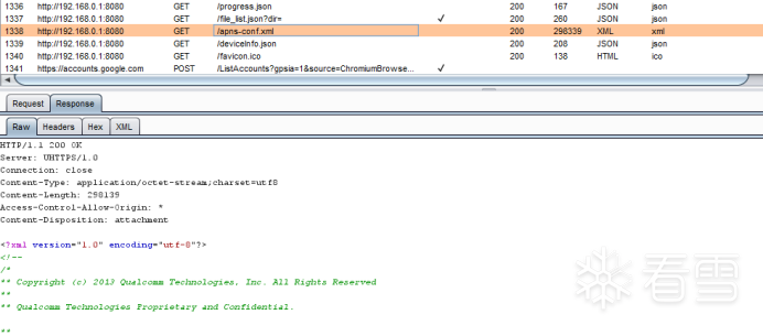 继续查看BurpSuite历史记录,发现http://192.168.0.1/apns-conf.xml请求也比较有意思,URI指定了一个文件名,返回包是文件内容。