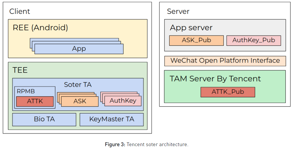 在Tencent soter中有三级密钥:设备密钥(ATTK)、应用密钥(ASK)、业务密钥(Authkey)。这些密钥都是RSA-2048非对称密钥,并且由TEE进行安全保护和存储。