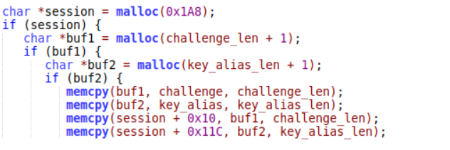 因此,攻击者可以提过一个大于0x198字节的挑战或大于0x8C字节的密钥名来覆写堆内容。