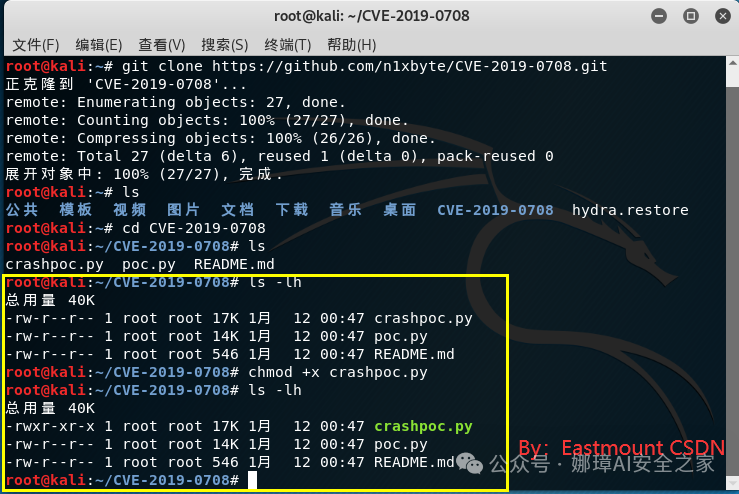输入下面的命令修改权限,“x”代表执行权限,可以看到“crashpoc.py”文件变成了绿色,表示可执行。同时该文件权限修改为“-rwx r-x r-x”。