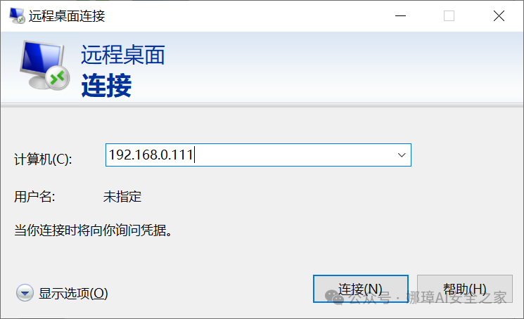 远程桌面连接中输入IP地址“192.168.0.111”,再点击“连接”按钮。