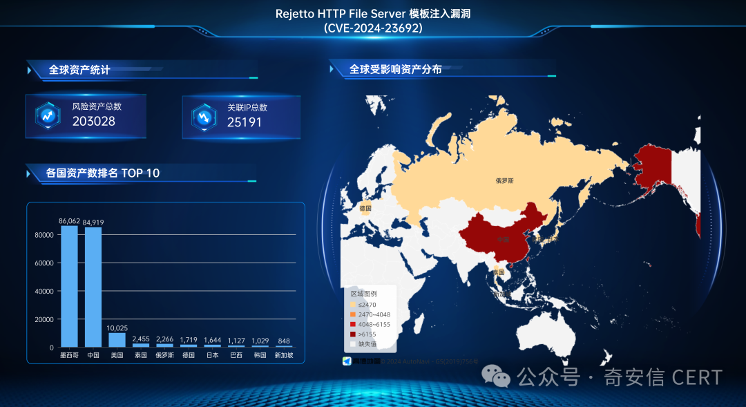 Rejetto HTTP File Server 模板注入漏洞(CVE-2024-23692)关联的全球风险资产总数为203028个,关联IP总数为25191个。全球风险资产分布情况如下: