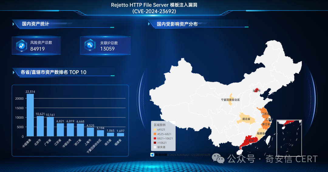 奇安信鹰图资产测绘平台数据显示,Rejetto HTTP File Server 模板注入漏洞(CVE-2024-23692)关联的国内风险资产总数为84919个,关联IP总数为13059个。国内风险资产分布情况如下: