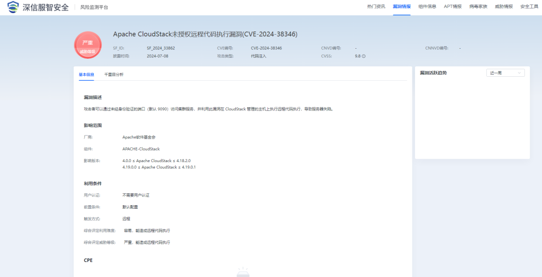 2024年7月9日,深瞳漏洞实验室监测到一则APACHE-CloudStack组件存在代码注入漏洞的信息,漏洞编号:CVE-2024-38346,漏洞威胁等级:严重。