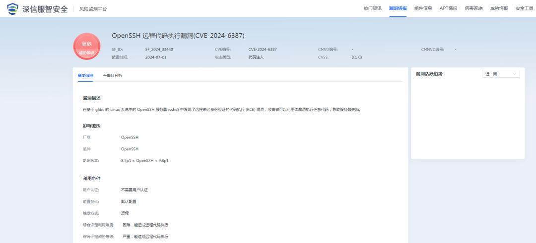 2024年7月2日,深瞳漏洞实验室监测到一则OpenSSH组件存在代码注入漏洞的信息,漏洞编号:CVE-2024-6387,漏洞威胁等级:高危。