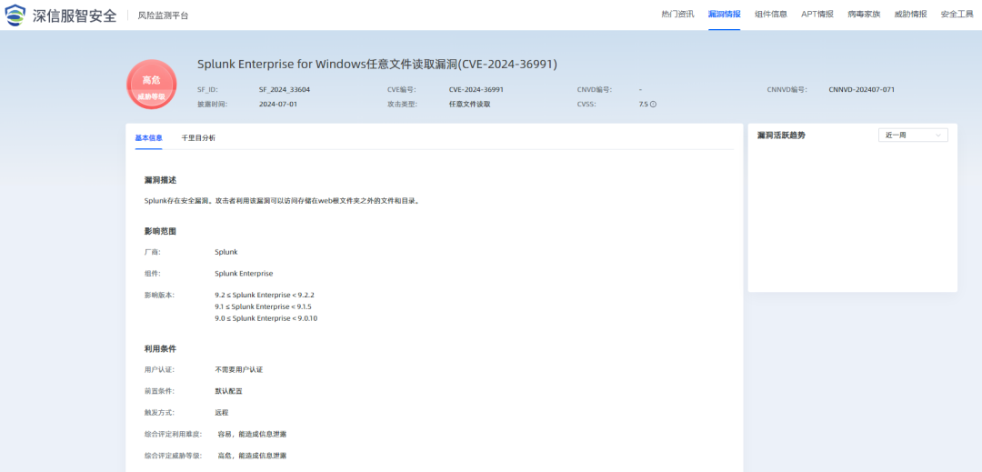2024年7月9日,深瞳漏洞实验室监测到一则Splunk Enterprise组件存在任意文件读取漏洞的信息,漏洞编号:CVE-2024-36991,漏洞威胁等级:高危。