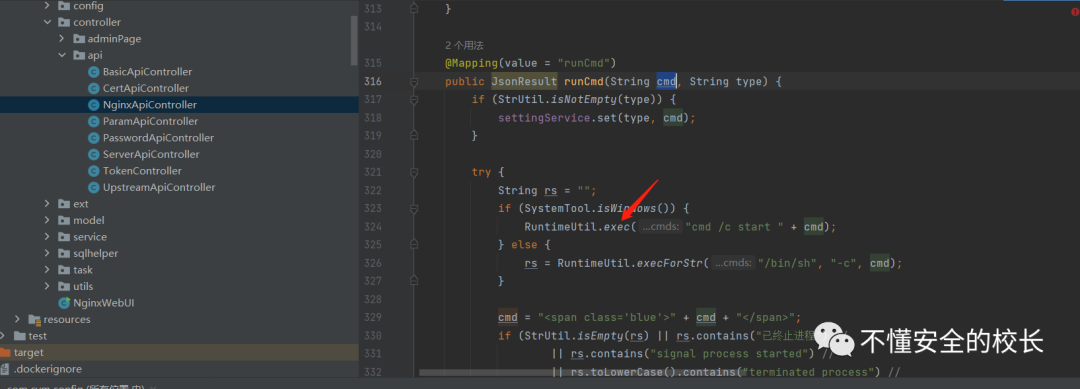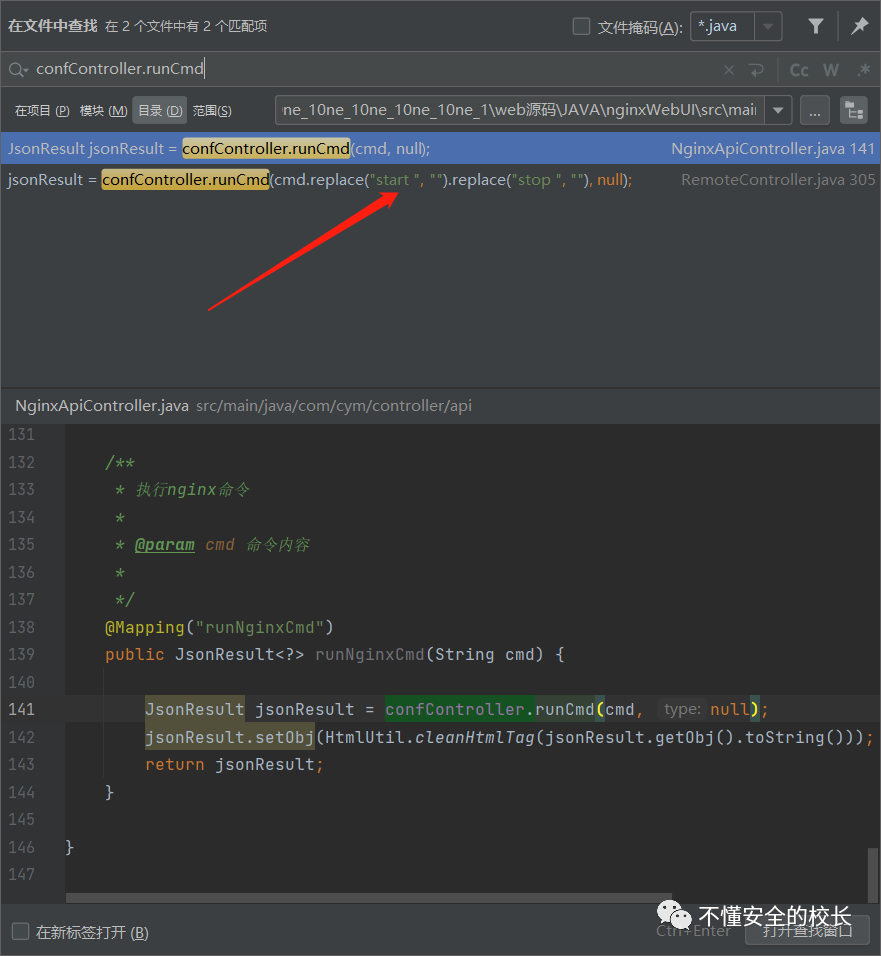 以此之外,我们还可以去寻找其他调用这个runCmd方法的类,挖掘出更多的RCE