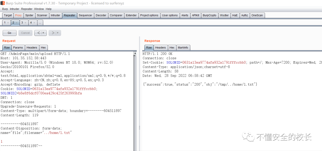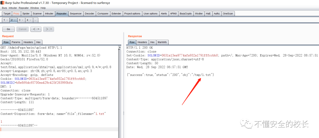 上传参数为file,这里直接是原生文件名。上传到了/tmp目录,不过文件名可控可以跨目录