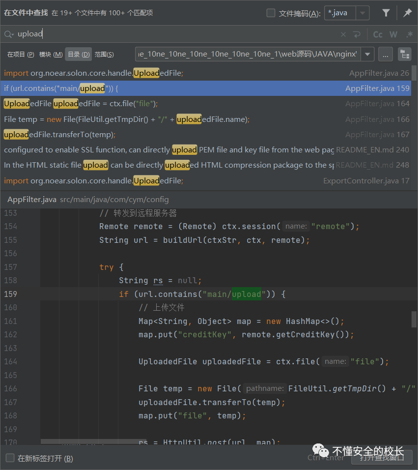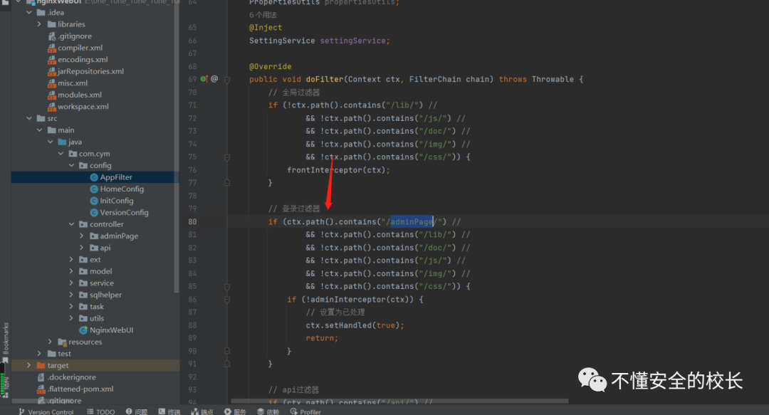config下目录AppFillter 类发现doFilter方法,通过全局过滤器发现这里校验不严格,可以大小写绕过。