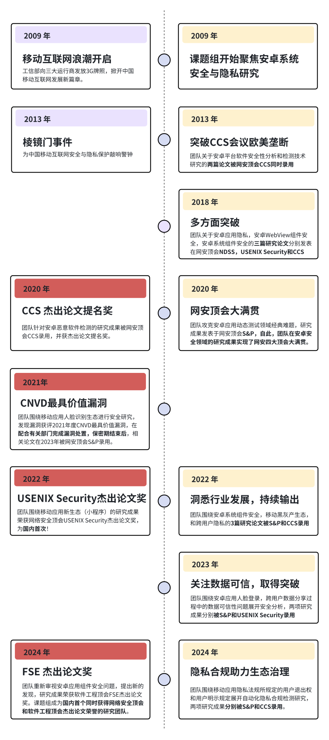 如下图展示,自2009年移动互联网浪潮开启,团队在杨珉老师的带领下布局安卓系统安全和隐私研究,带着“十年磨一剑”的坚定决心和顽强意志,埋头苦干,攻坚克难。2013年,棱镜门事件为中国移动互联网安全与隐私保护敲响警钟,也是这一年,团队首次在网络安全顶会CCS上发表2篇研究成果,突破了欧美高校和研究机构的垄断。随后几年,团队在移动安全领域实现多方面突破,在2020年实现网络安全领域Top-4顶尖学术会议大满贯并获得CCS杰出论文提名奖,到2022年成为国内首个荣获网络安全顶尖学术会议USENIX Security杰出论文奖荣誉的团队,并且在2024年荣获软件工程领域顶尖学术会议FSE杰出论文奖。如今,复旦白泽团队的研究成果数量已经在全球安全天梯排行榜