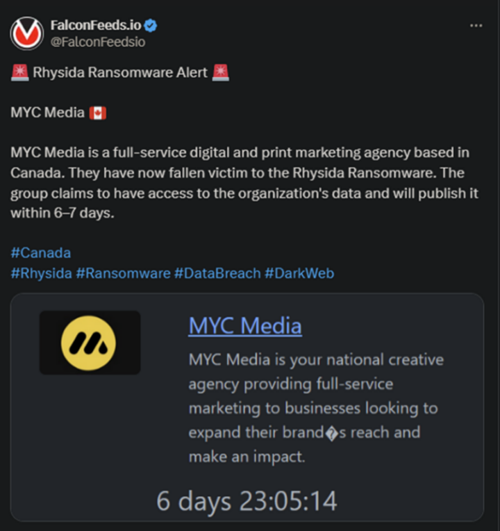 Rhysida勒索软件组织宣布他们已经入侵了加拿大的MYC Media公司。攻击者给出了7天的谈判期限,否则他们将在暗网公开泄露被盗数据,通常在暗网上进行。