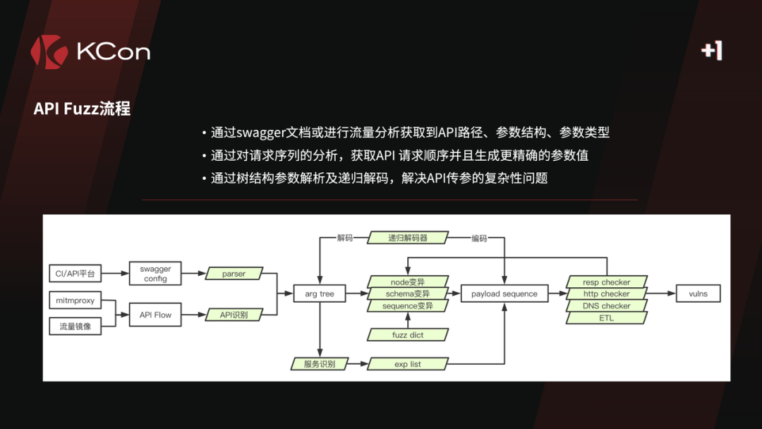 面对传统Web Fuzz方法存在的一些弊端,会上,吕竭分享了一种自动化API采集-解析-Fuzz的方法,并针对API的协议复杂性、参数结构复杂性、请求序列依赖等问题给出自动化测试思路,并通过具体的API Auto Fuzz所发现的漏洞案例阐述这一过程。