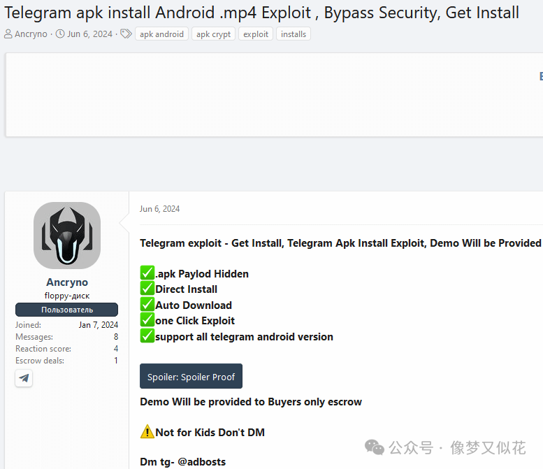 2024年6月26日:在2024年的一个地下论坛上,ESET研究团队发现了一个针对Android版Telegram的零日漏洞利用的广告。