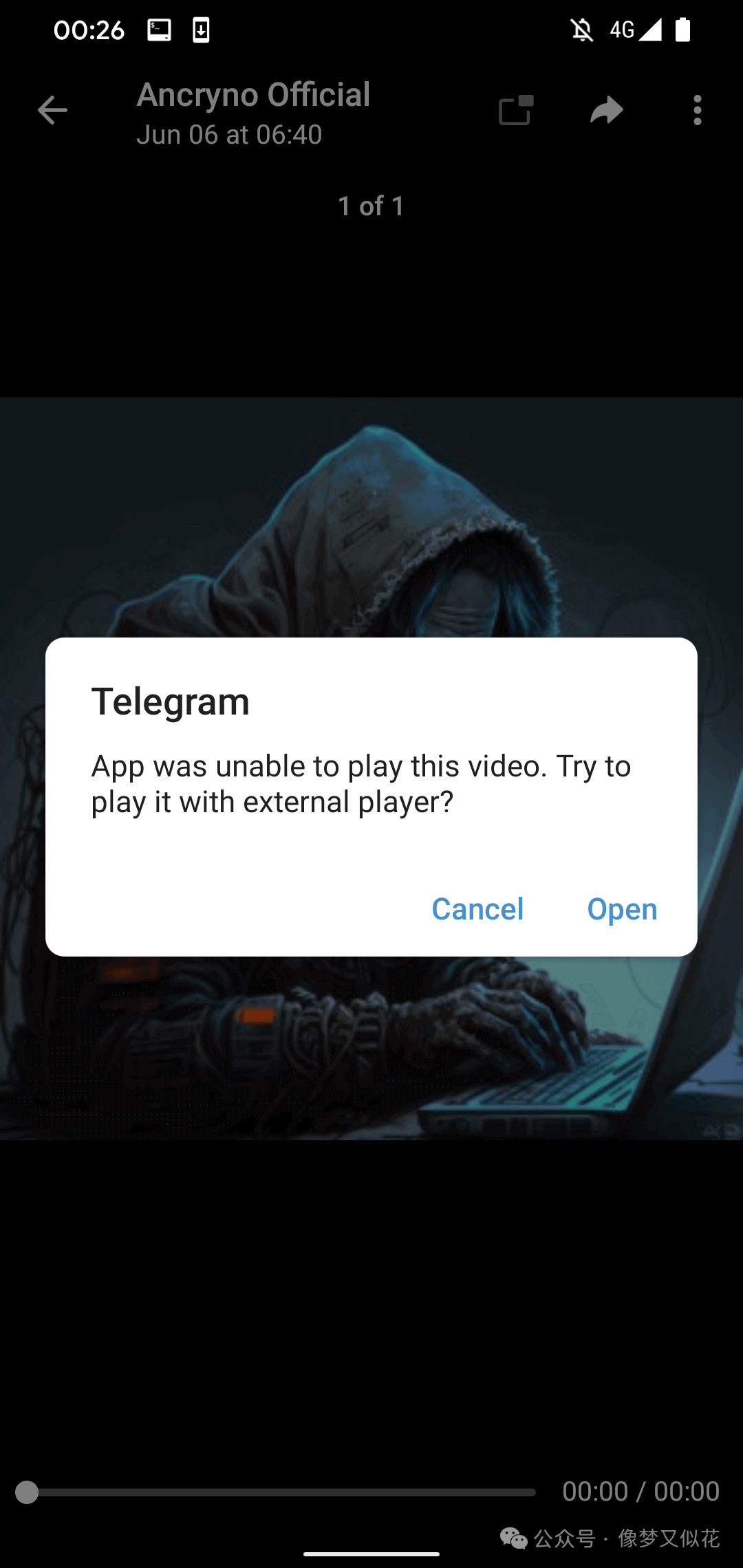 如果用户试图播放“视频”,Telegram会显示一条消息,指出无法播放,并建议使用外部播放器(参见图4)。这是ESET研究团队在合法Telegram for Android应用程序的源代码中发现的原始Telegram警告;它不是由恶意有效负载精心制作和推送的。