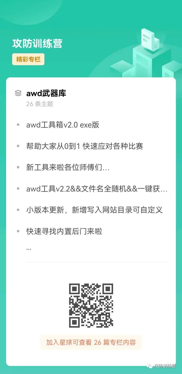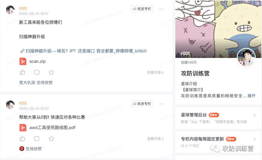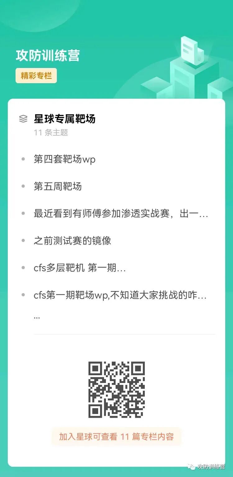 攻防训练营是高质量的网络安全领域星球,星球中有针对安全新人的优秀入门学习资料、