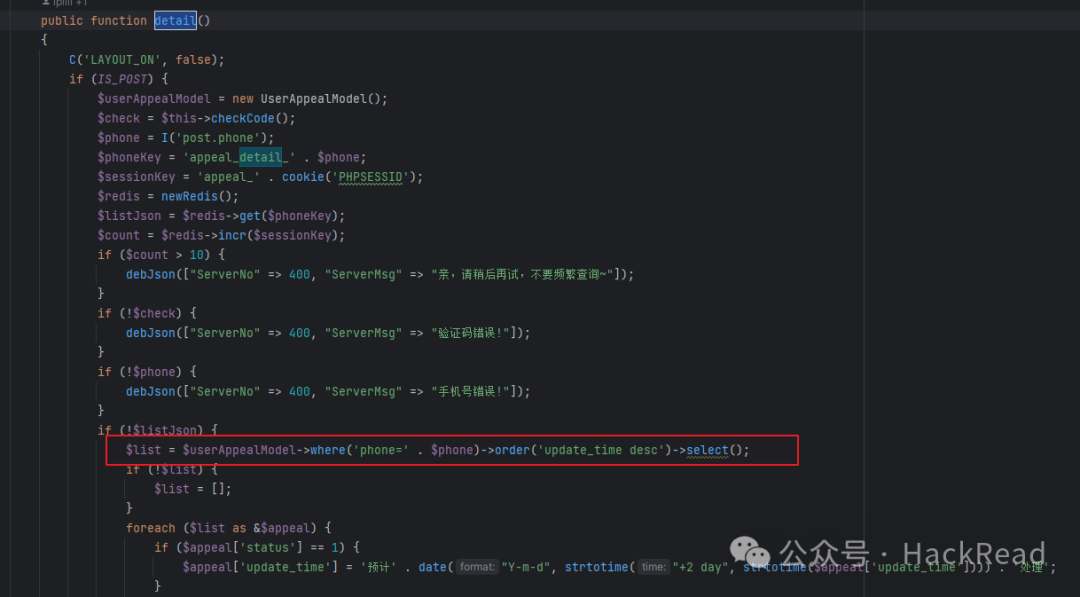 $listJson 的设置就尤为关键了 if (!$listJson) 这里的语句是 我的redis去查phone就是要查不到 为null才能执行下面的sql语句,所以phone就是要不存在的手机号才行,所以就直接随机phone就可以了,但是他在后续的代码中把这跟手机号给设置进了redis中