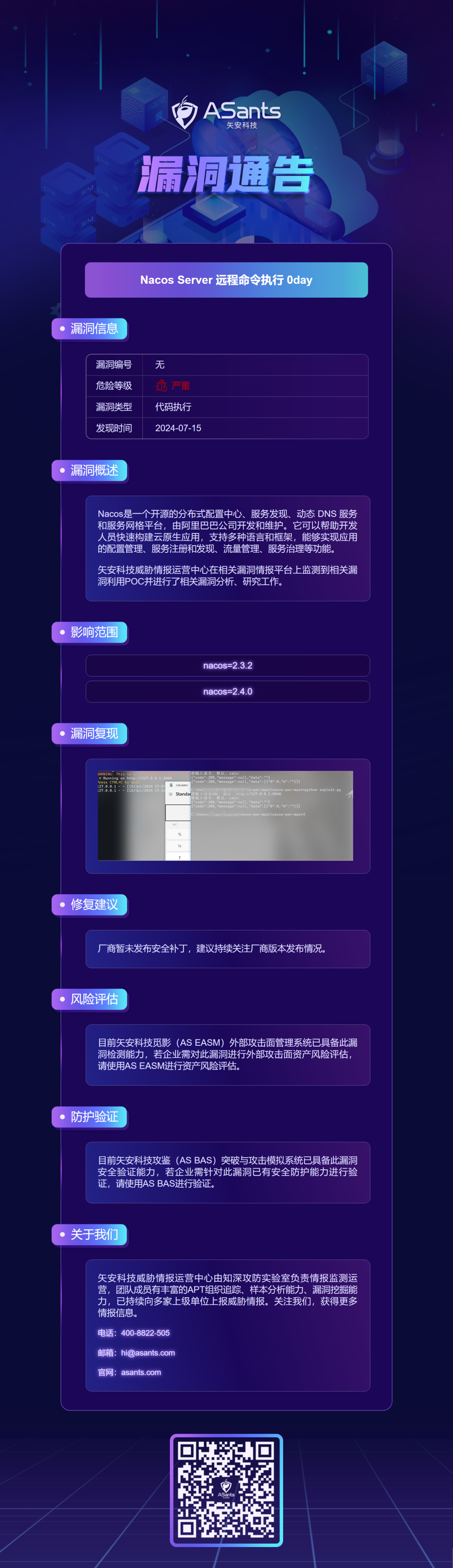 漏洞通告|Nacos Server 远程命令执行 0day 发布于2024年7月16日2025年7月19日 作者:cve-20 漏洞通告|Nacos Server 远程命令执行 0day 威胁情报运营中心 矢安科技 2024-07-15 18:20