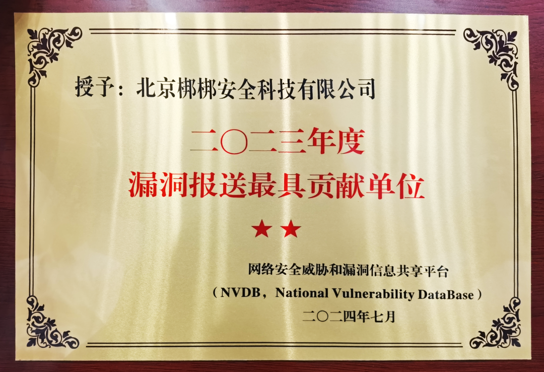 近日,工业和信息化部网络安全威胁和漏洞信息共享平台(NVDB)对2023年度在网络产品安全漏洞管理方面作出杰出贡献的单位进行表彰。梆梆安全凭借在移动安全领域的技术实力荣膺「2023年度漏洞报送最具贡献单位」。