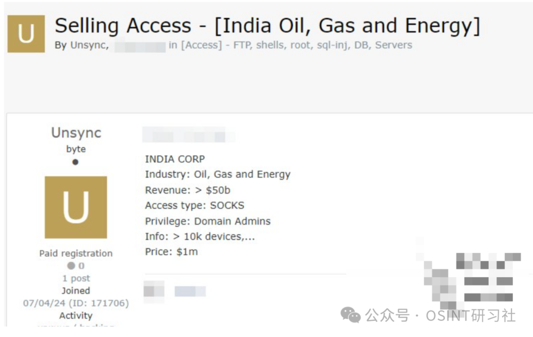 据称,另一名黑客正在向一家印度大型石油、天然气和能源公司出售未经授权的 SOCKS 访问权限。据报道,该公司的收入超过 500 亿美元。访问权限包括域管理员权限,可控制公司网络中的 10,000 多台设备。此访问权限的要价为