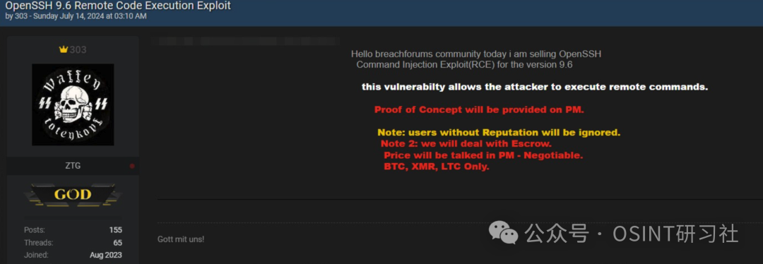 威胁者出售 OpenSSH 9.6 版命令注入漏洞