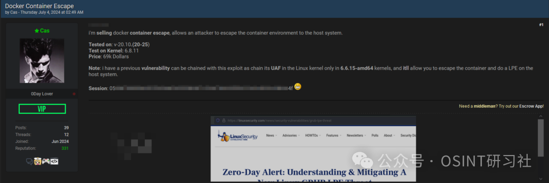 据称,一名黑客正在暗网论坛上出售 Docker 容器逃逸。根据论坛上的帖子,这允许攻击者将容器环境逃逸到主机系统。还表示,同一威胁行为者发布的先前漏洞可以与此漏洞链接在一起。