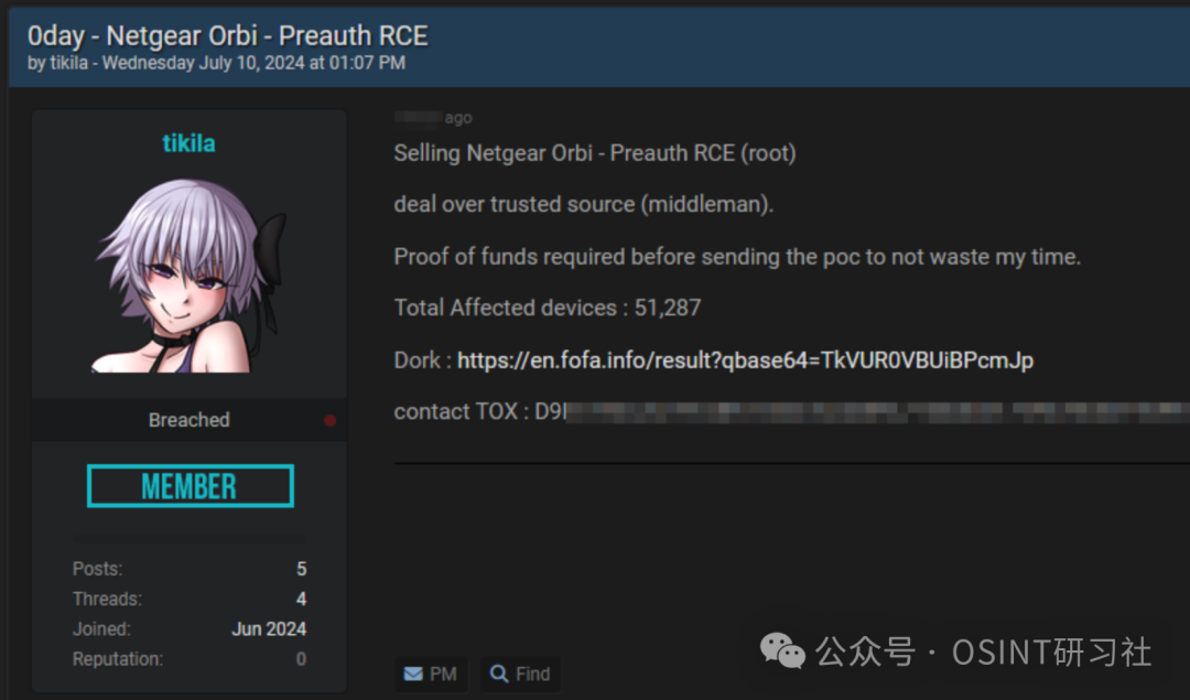 一名黑客宣布出售 Netgear Orbi 路由器的零日 (0day) 漏洞,该漏洞允许以 root 权限进行预认证远程代码执行 (RCE)。据该威胁者称,该漏洞共影响 51,287 台设备。