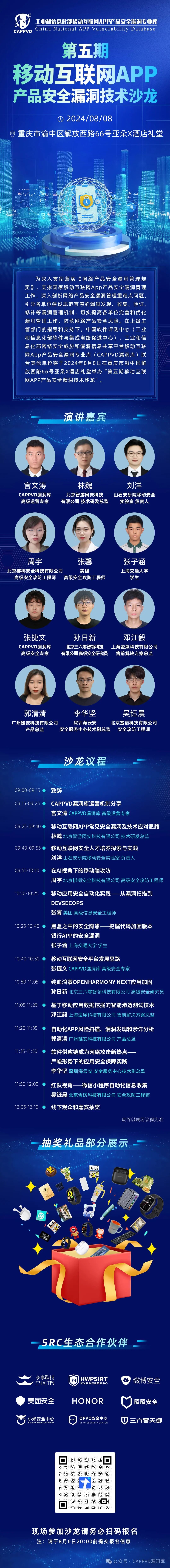 诚挚邀请各网络产品提供者、安全研究者、移动应用商店、网络安全厂商、企业SRC、行业专家、安全爱好者及网络安全媒体等参加本次沙龙。探索最前沿的漏洞技术发展趋势和创新应用,共同搭建权威、专业、深度、创新的交流平台。