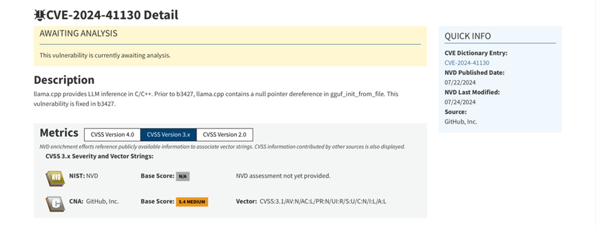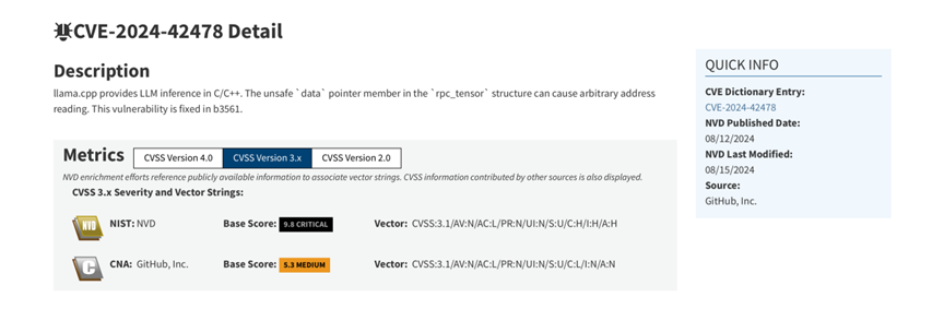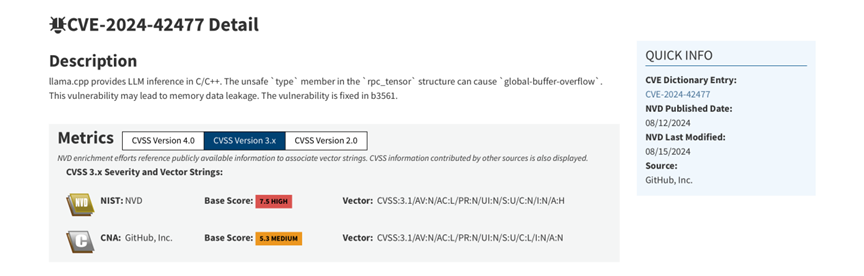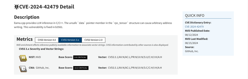 但比起带给人类的福利,人们似乎更担心大模型将加诸于社会的危害。近日,知名开源大模型开源软件库llama.cpp发布了一系列安全风险预警和软件更新公告,公布了由360漏洞研究院发现的llama.cpp在加载模型和分布式推理场景中存在的多个安全漏洞。其中影响最大的漏洞是CVE-2024-42479, CVSS评分为9.8/10,表明存在较高的利用风险,如若被组合利用可实现远程命令执行。