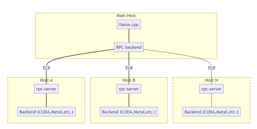 当远程设备运行了RPC-server后,llama.cpp会通过RPC后端作为“老板”与一个或多个远程RPC-server”部门“通信,将计算任务分配给它们,从而实现高效的分布式多主机推理。