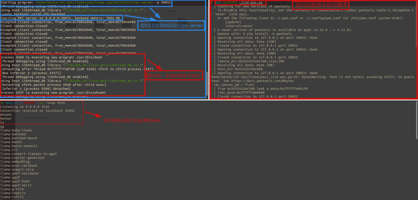 换句话说,一旦llama.cpp在分布式多主机推理的过程中被恶意攻击者利用漏洞进行攻击,攻击者可以在未授权的情况下,实现执行恶意命令、窃取用户敏感数据、窃取AI模型,甚至控制所有推理设备等一系列操作。