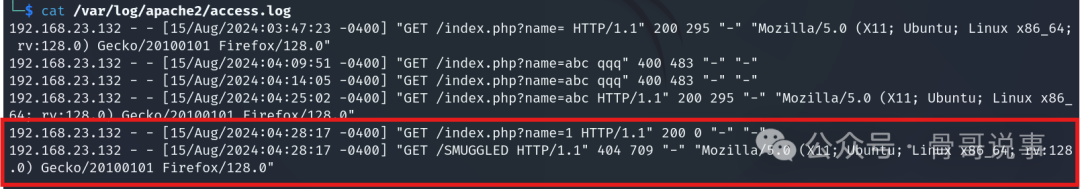 按F5直接运行后,查看Kali服务器的access.log,可以看到请求成功发送给了后端服务器,造成请求走私: