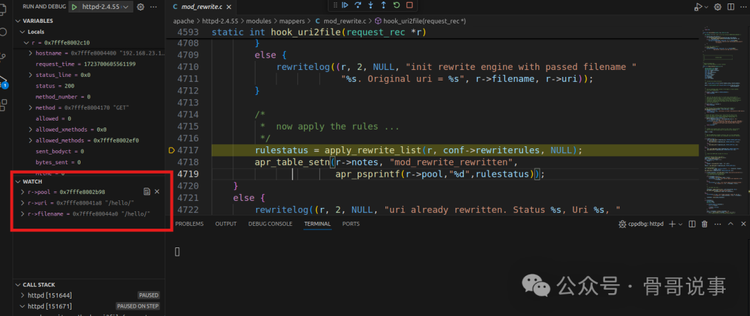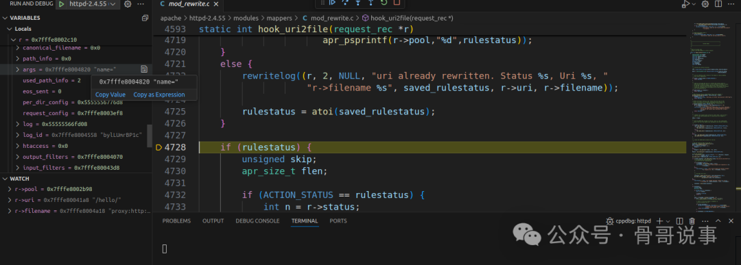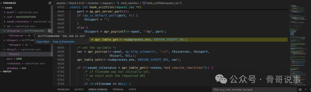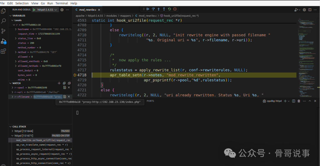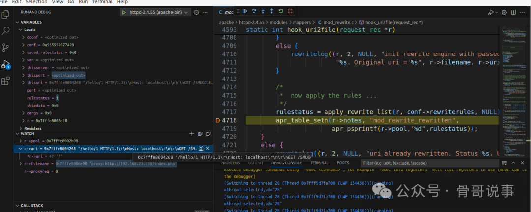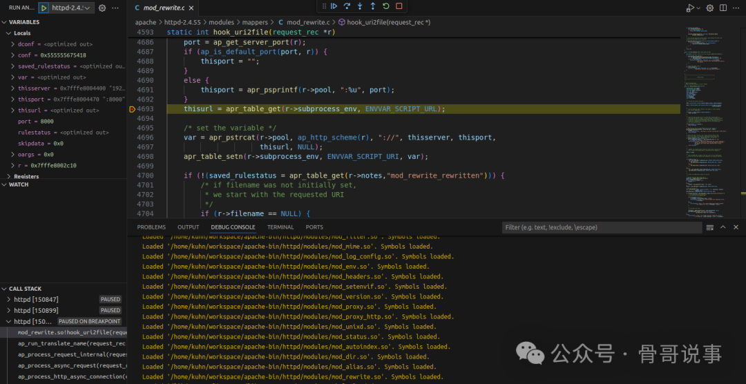 我们可以将断点打在modules/mappers/mod_rewrite.c的4693行: