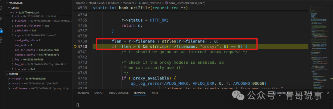 漏洞点在mod_rewrite.c的hook_uri2file函数中,当uri匹配到正则时,就会进行RewriteRule规则替换,然后准备一个新的请求交给mod_proxy: