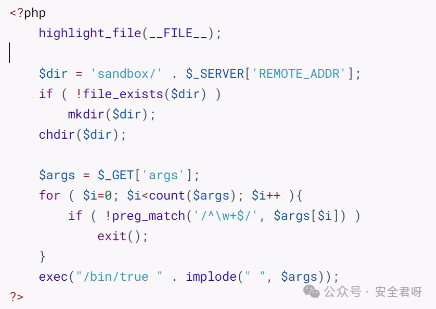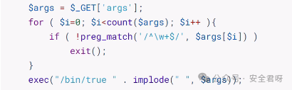 接受GET方式提交的参数args (数组)匹配数组中每一项是否只由数字、 字母、下划线组成,最后执行/bin/true命令,并且拼接args参数。