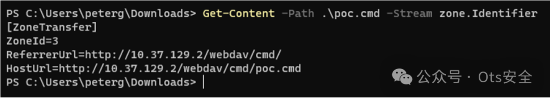 当用户从不受信任的来源(例如 Web)下载文件时,Windows 会将 Web 标记添加到文件的本地副本中。Web 标记由名为 Zone.Identifier 的 NTFS 备用数据流 (ADS) 组成。此流中包含文本ZoneId=3,表示该文件来自不受信任的来源。