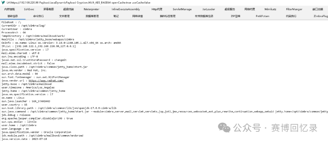 zimbra 使用的中间件为Jetty,运行时注入一个/* 的Filter,恶意Filter作为服务端以内存形式存在于系统中,每个请求都会经过FIlter处理,正常业务逻辑放行,只有当使用Godzilla客户端访问时,才会触发Filter中代码逻辑