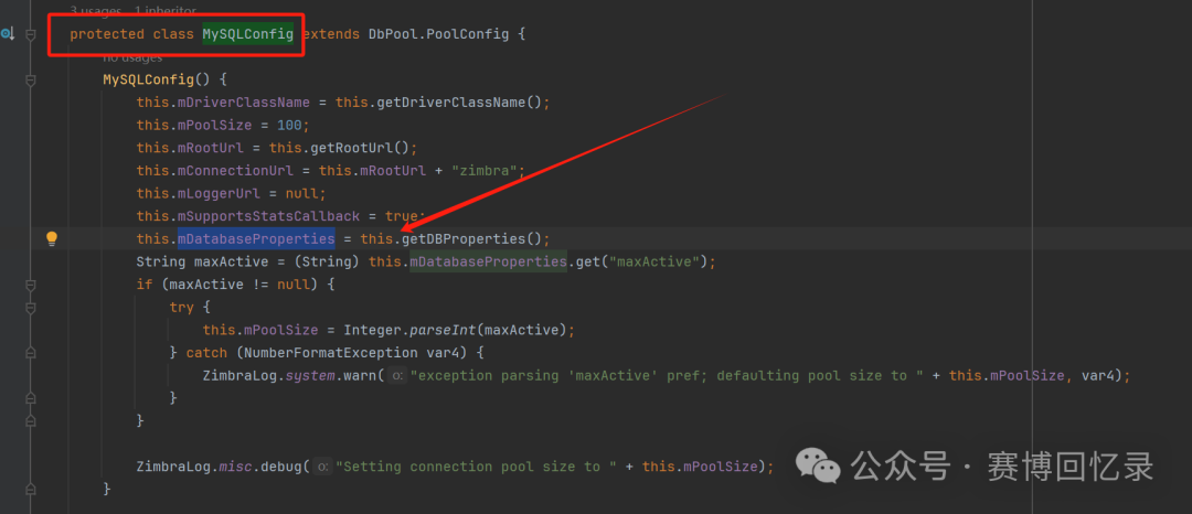 很幸运地我们可以直接调用com.zimbra.cs.db.MySQL#getPoolConfig方法获取到数据库属性信息