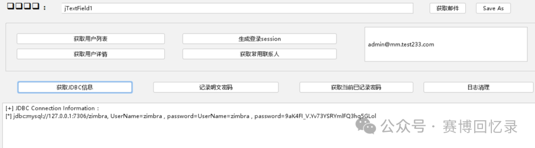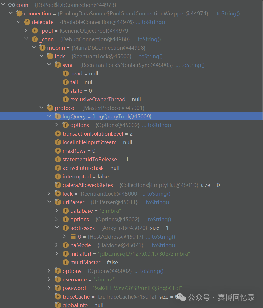 jdbc连接信息往往都以加密的方式存放在某个文件中,既然我们可以在运行时执行代码,不如直接获取内存中解密后的明文连接信息,通过debug后可知,jdbc连接信息存储在com.zimbra.cs.db.MySQL.MySQLConfig类中,