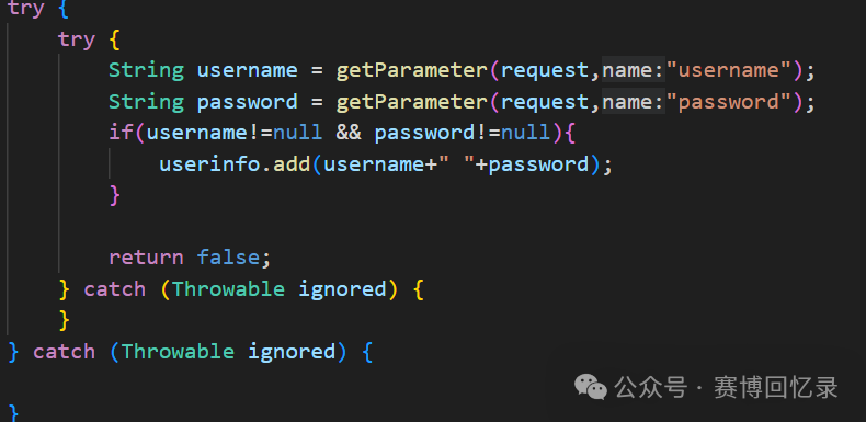 Listener核心代码记录逻辑将用户传入的username,password存储到类变量中,RecordPassword核心逻辑如下