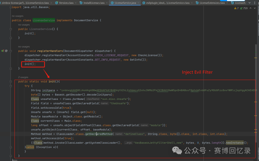 避免服务重启导致Filter失效,修改zimbra-license-success插件,每次服务重启都会加载插件,对插件进行初始化,通过修改插件初始化逻辑com.zimbra.cs.network.license.service.LicenseService,使得每次重启都会注入恶意Filter内存马