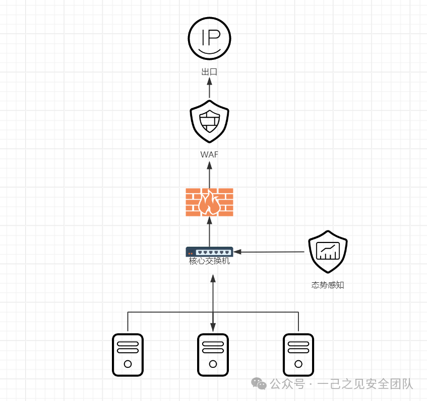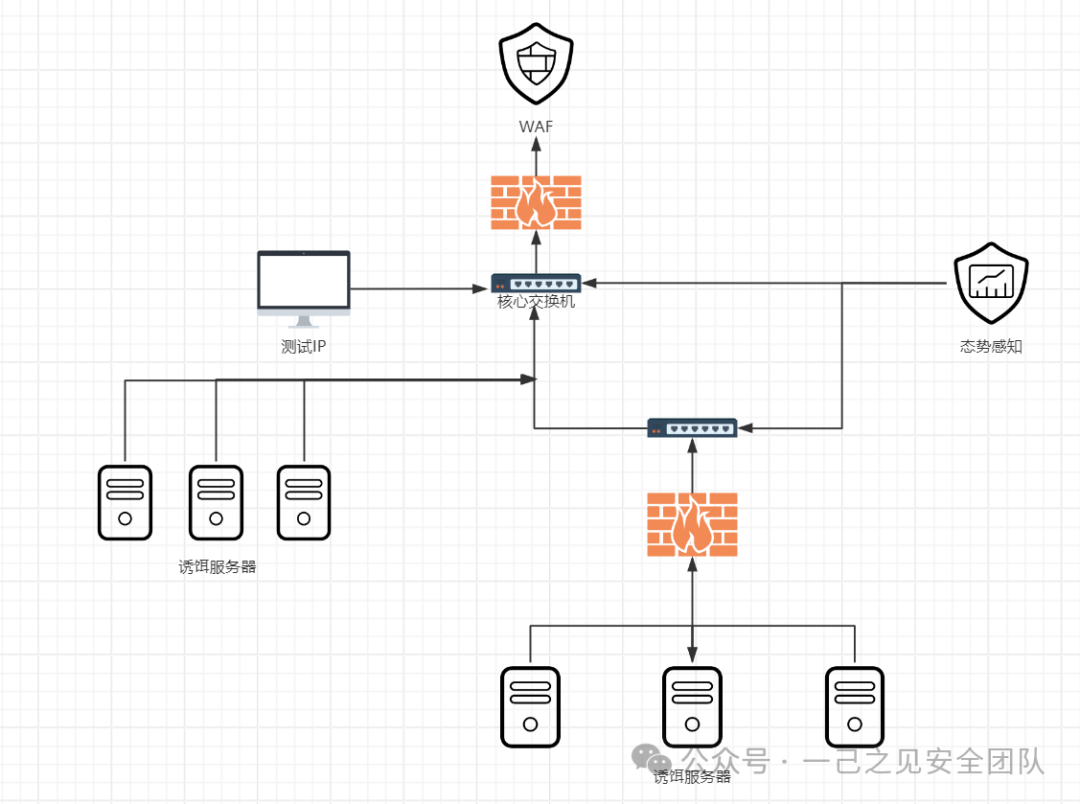 这是一个简略的架构,省略负载、路由器,正常的逻辑基础都是这么构建的,服务器出网前需要经过核心交换机、防火墙和waf,态感读取核心镜像流量。这套逻辑本身没有问题,符合防护和监控的需求,但如果是0day,假设某系统的0day只需要传入一个参数到web即可rce,但该参数风险未知,态势感知可能未必能读取到威胁并告警,这也是绝大部分中小安全项目的弱点,无法主动防御捕获。当然了,有蜜罐除外。