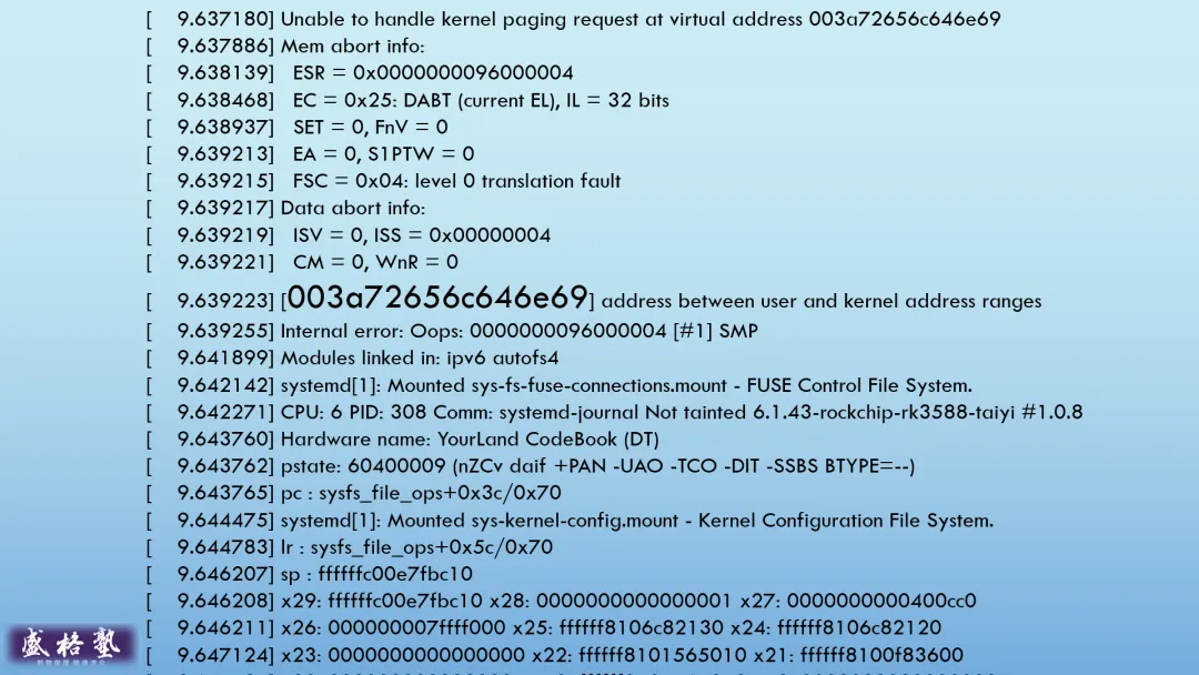 [ 33.918283] CPU: 5 PID: 1 Comm: systemd Not tainted 6.1.43-rockchip-rk3588-taiyi #1.0.8 [ 33.918283] CPU:5 PID:1 通信:systemd 未污染 6.1.43-rockchip-rk3588-taiyi #1.0.8