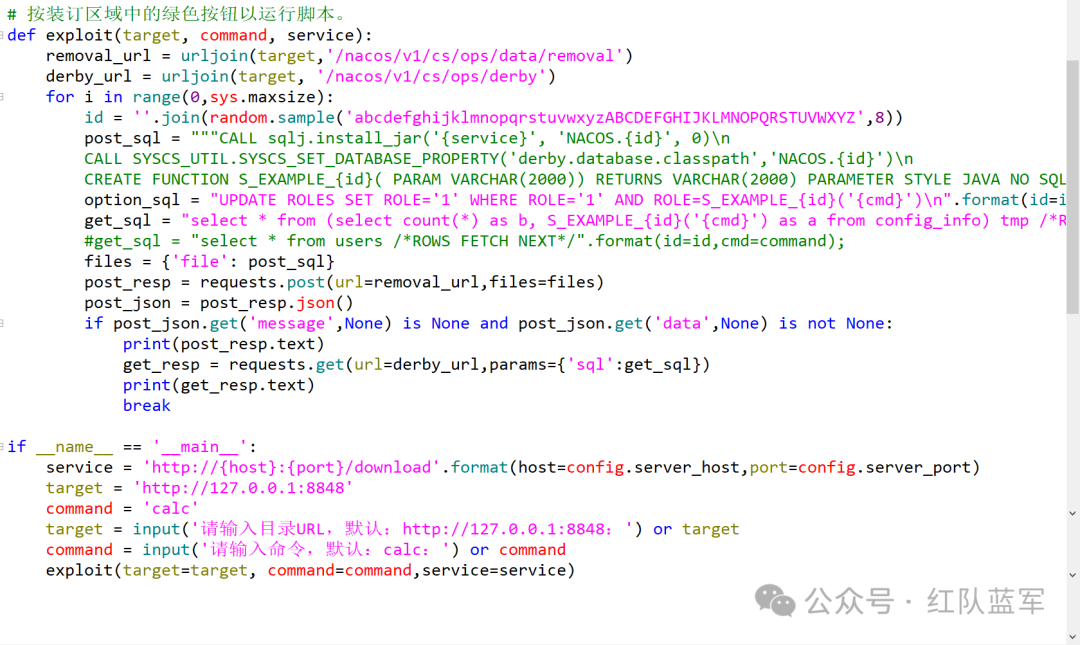 exploit.py会连接Nacos,然后请求Nacos的参数中注入了连接service.py的IP、端口,以及需要RCE的指令。请求到达nacos之后,利用deby数据库的漏洞,恶意请求service.py服务的接口,加载jar包内容。然后再输入RCE指令给jar包,运行这个命令。
