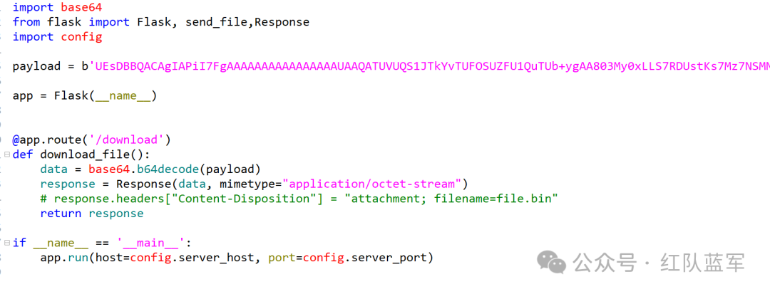 Flask应用程序提供了一个简单的文件下载服务。用户访问 /download 路由时,服务器会返回一个解码后的二进制文件。这个文件最初是通过Base64编码存储在 payload 变量中的。应用程序的主机和端口信息从 config.py 模块中读取